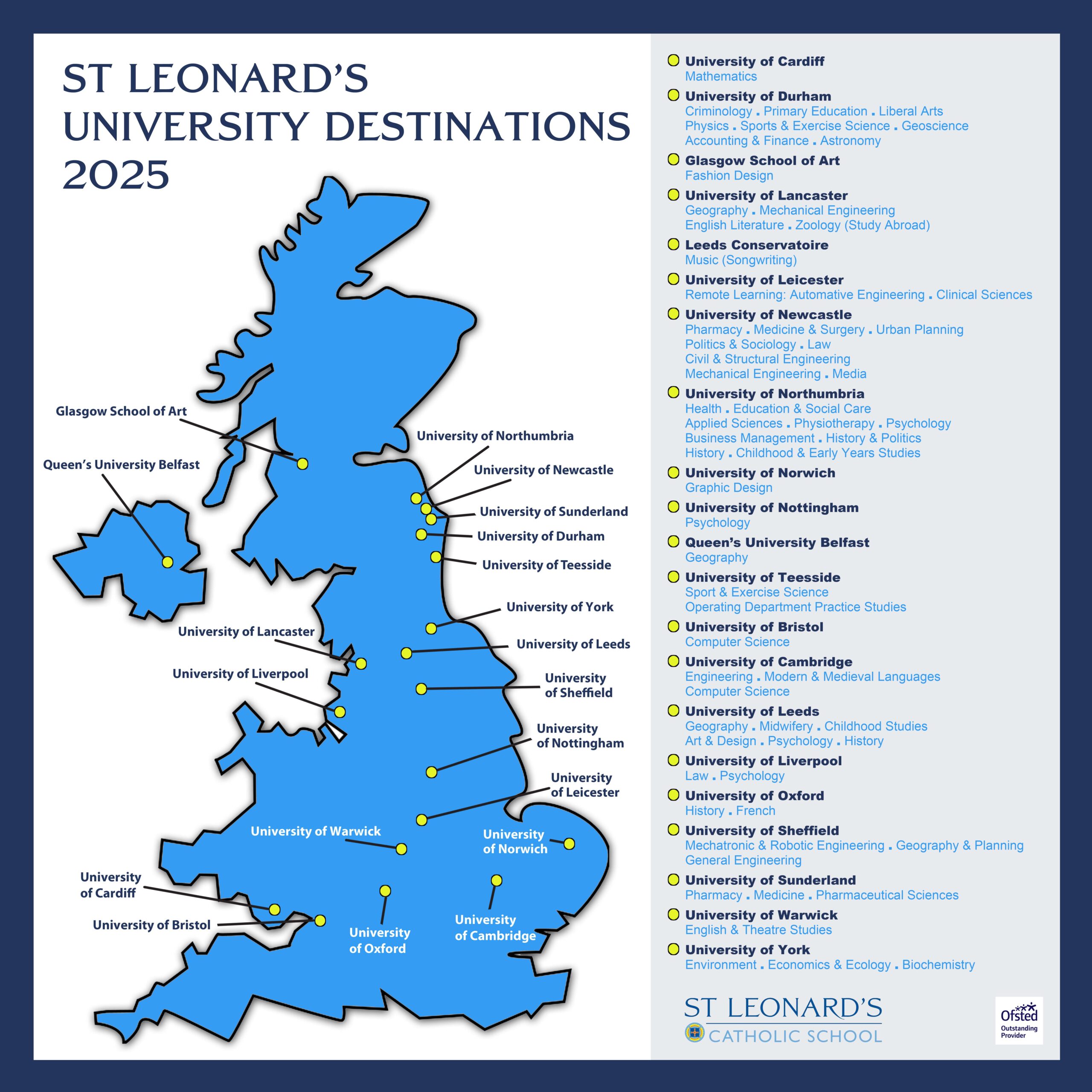 A Level: St Leonard’s students achieve very strongly, and we are ranked amongst the highest performing schools in the North East for university destinations, with over half of our students progressing to Russell Group Universities and a significant number to Oxford and Cambridge. See recent news here.